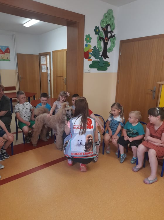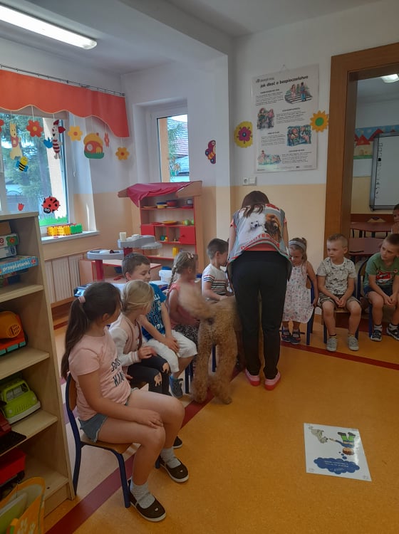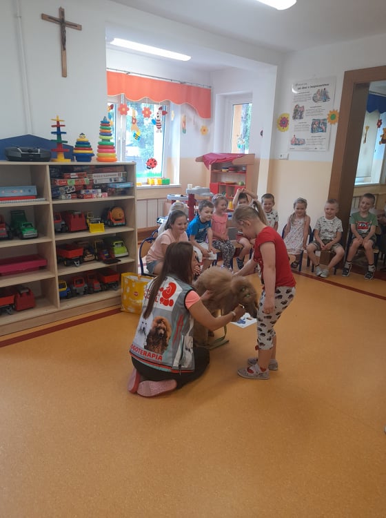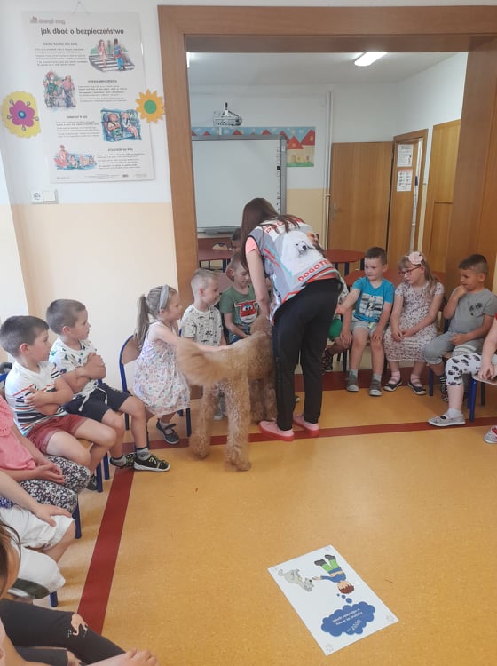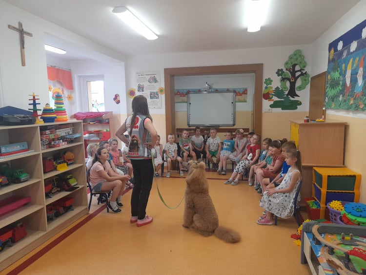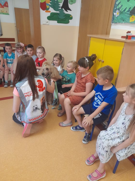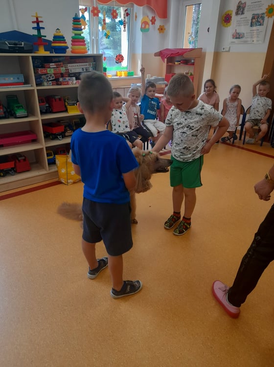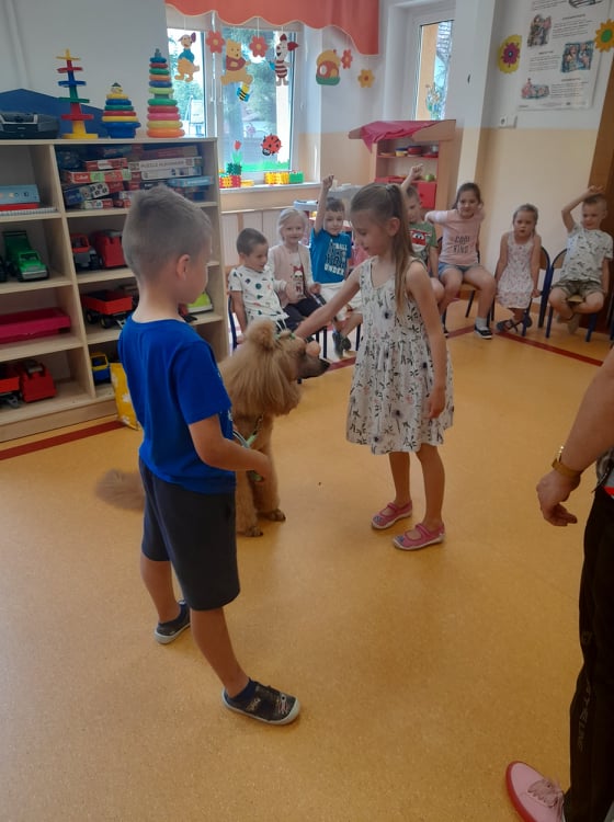Nasze przedszkole odwiedził wspaniały pies. Dzieci zostały przeszkolone jak traktować zwierzęta oraz jak zachować się w przypadku spotkania z psem agresywnym. Dzieci miały również okazję pogłaskać i pobawić się z psem.