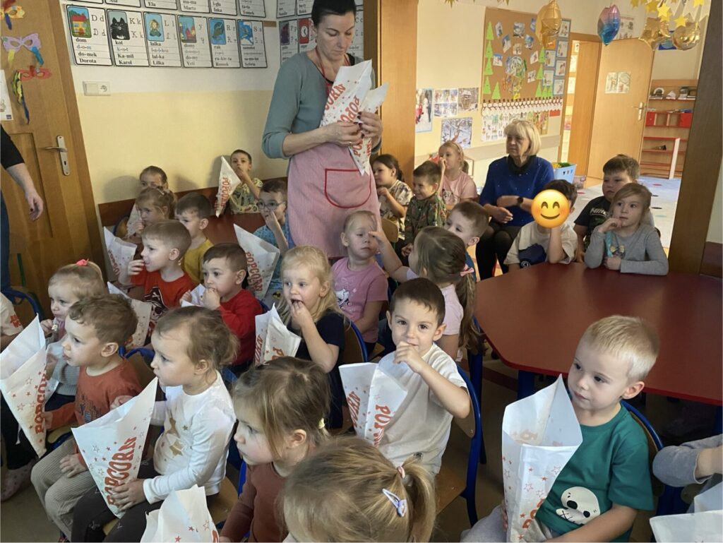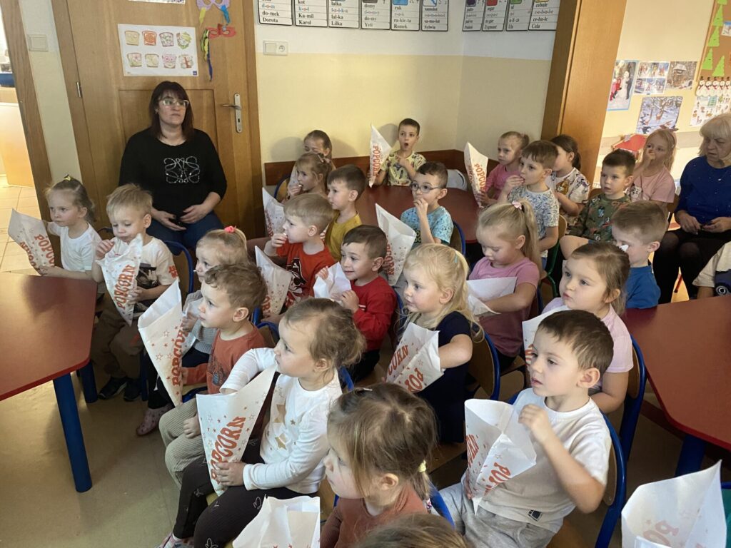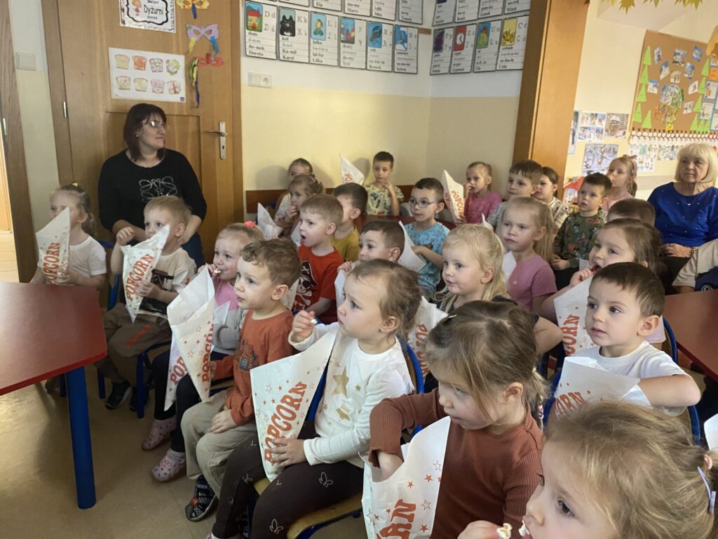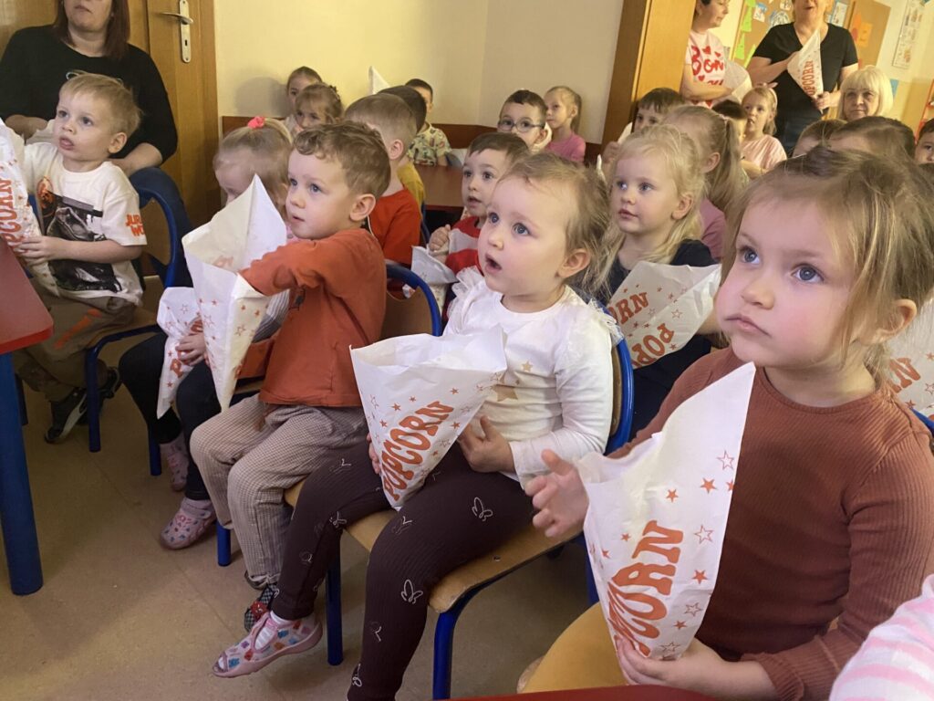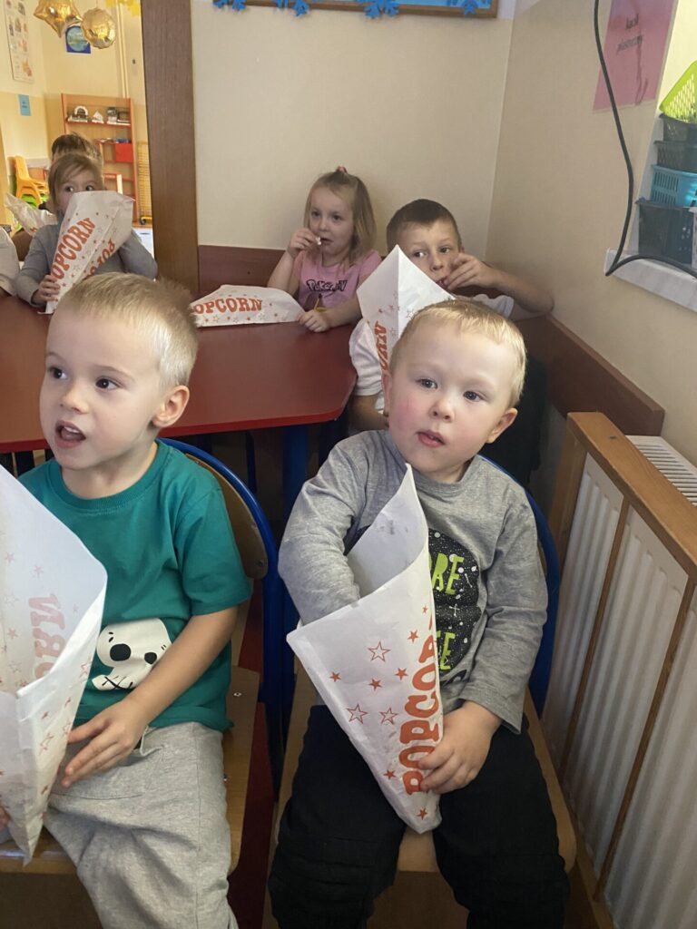 Kulminacyjnym punktem dnia był seans filmowy. Z taką przekąską oglądanie ulubionych bajek smakowało wyjątkowo! Dzieci poczuły się jak w prawdziwym kinie, ucząc się przy tym kulturalnego zachowania podczas seansu.