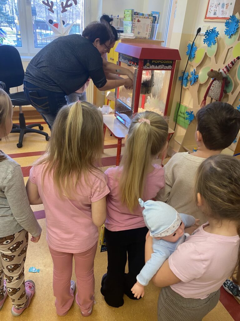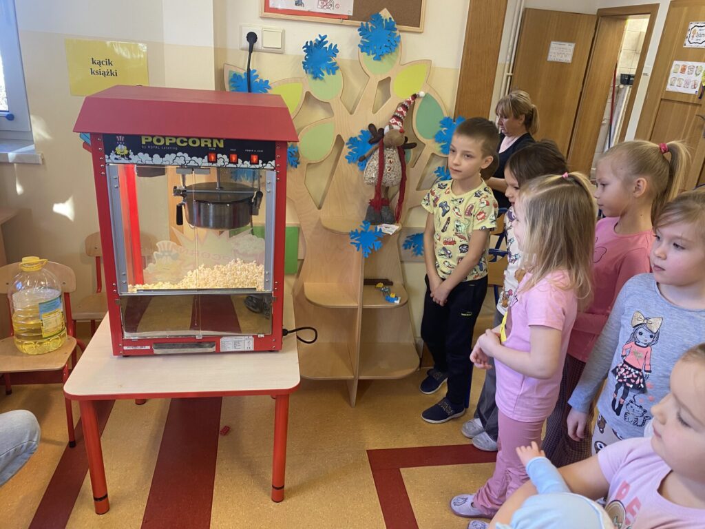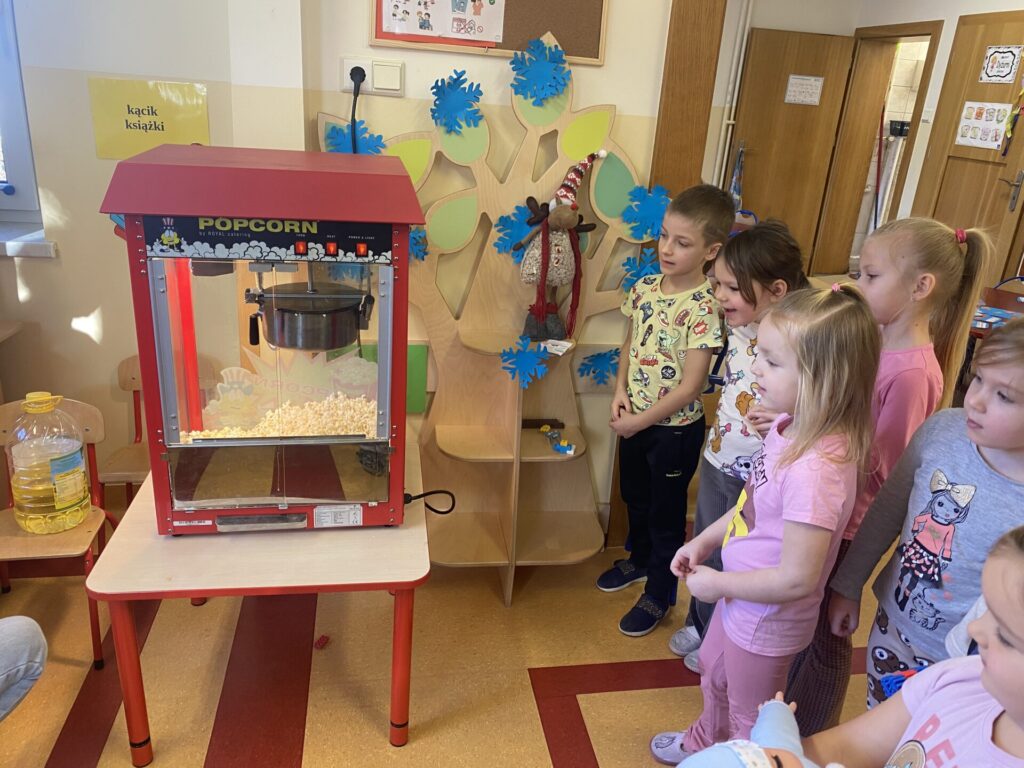 To był dzień pełen chrupania, radosnego strzelania i kukurydzianego szaleństwa! 19 stycznia nasze przedszkole zamieniło się w prawdziwą krainę popcornu. Obchody Światowego Dnia Popcornu dostarczyły dzieciom mnóstwo radości i doznań smakowych. Dzień rozpoczęliśmy od zajęć badawczych. Przedszkolaki miały okazję przyjrzeć się z bliska twardym, złocistym ziarnom kukurydzy. Dowiedziały się, że wewnątrz każdego ziarenka ukryta jest kropelka wody, która pod wpływem ciepła zamienia się w parę i powoduje widowiskowy „wybuch”. Największą atrakcją było wspólne prażenie popcornu. Dzieci z zaciekawieniem nasłuchiwały charakterystycznego pykania dochodzącego z maszyny, a zapach świeżego popcornu szybko wypełnił wszystkie sale