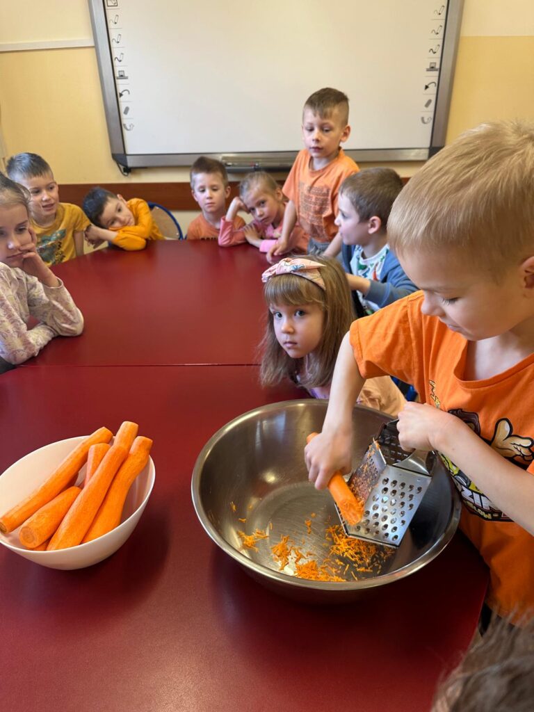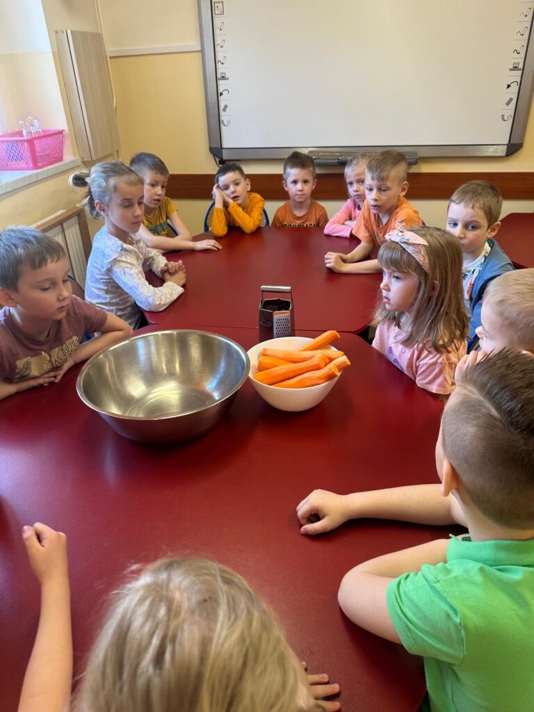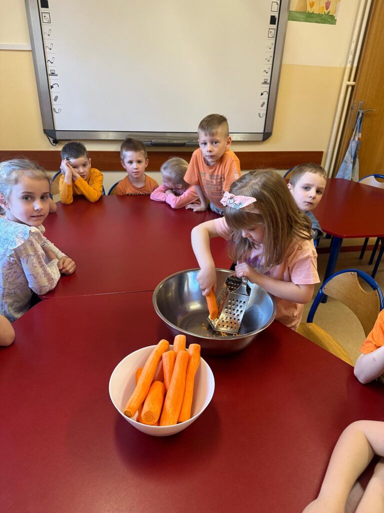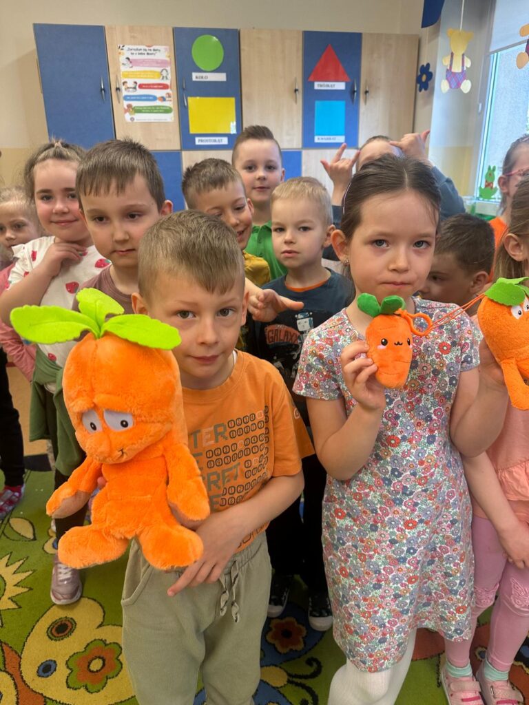 Dzień marchewki w przedszkolu to święto, które przypada 4 kwietnia. Celebruje się je, by zachęcić dzieci do jedzenia tego warzywa i poznania jego właściwości. Na to święto dzieci naszego przedszkola ubrały się w kolory przypominające marchewkę oraz przyniosły ze sobą pluszowe warzywa. Realizując program ’’Skąd się biorą produkty ekologiczne?” przedszkolaki poznały zalety i walory marchewki. Z filmu edukacyjnego dzieci mogły się dowiedzieć wiele ciekawych rzeczy: jak bardzo jest zdrowa , ile zawiera cennych witamin i składników odżywczych, jak korzystnie wpływa na skórę, włosy oraz wzrok. Ten „bardzo zdrowy dzień pomarańczowy” wypełniony był zabawami przy piosenkach o marchewce, pracami plastycznymi oczywiście o marchewce , wykonaniem surówki z marchewki i jabłka a także degustacją marchewkowego ciasta. Był to dzień ,w którym wszyscy dobrze się bawili i zdrową marchewkę bardzo polubili.