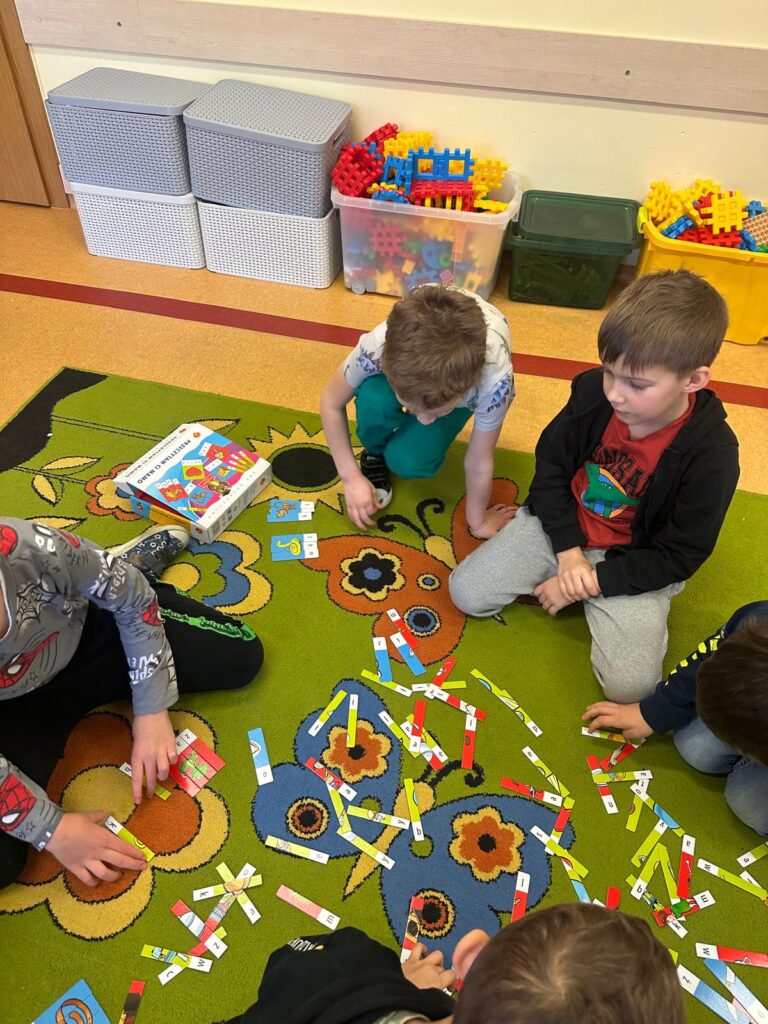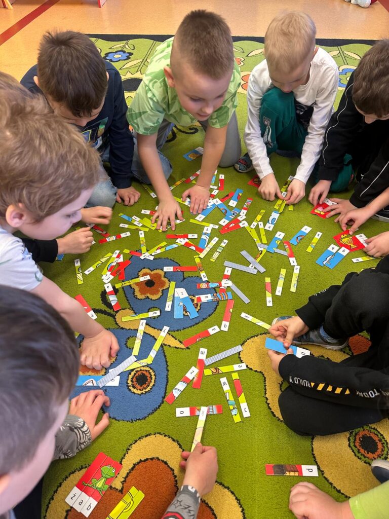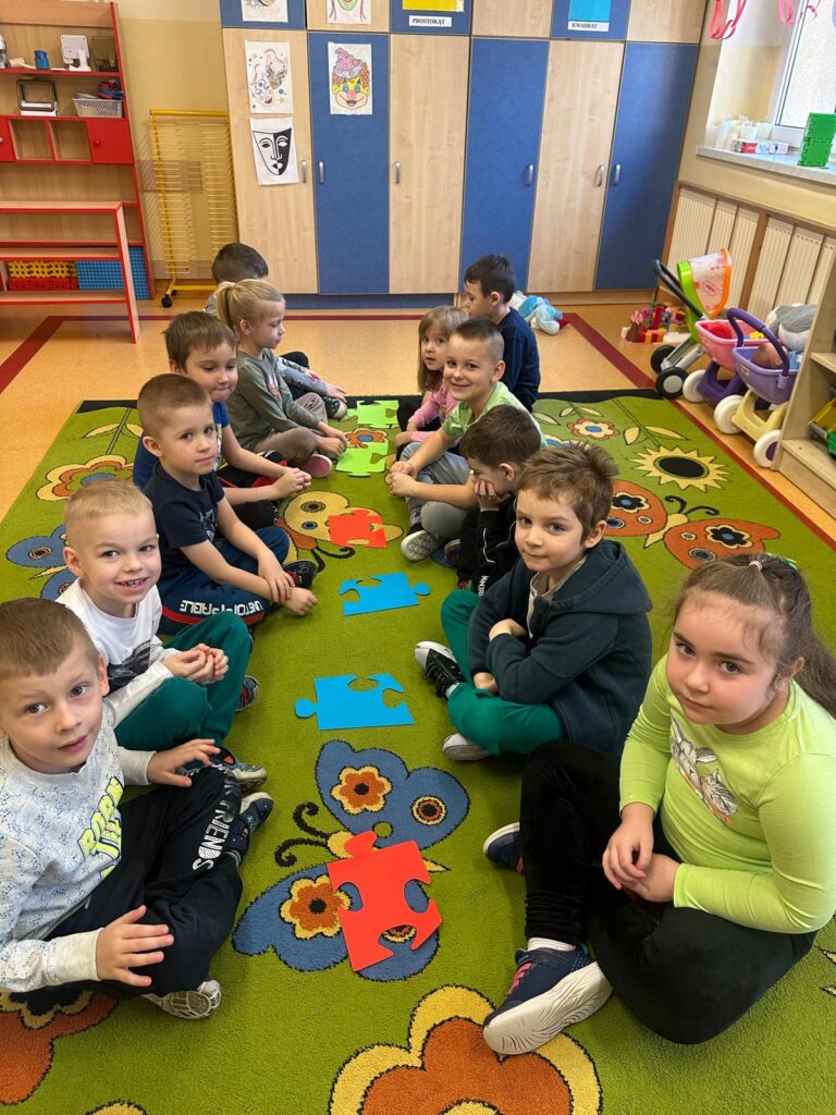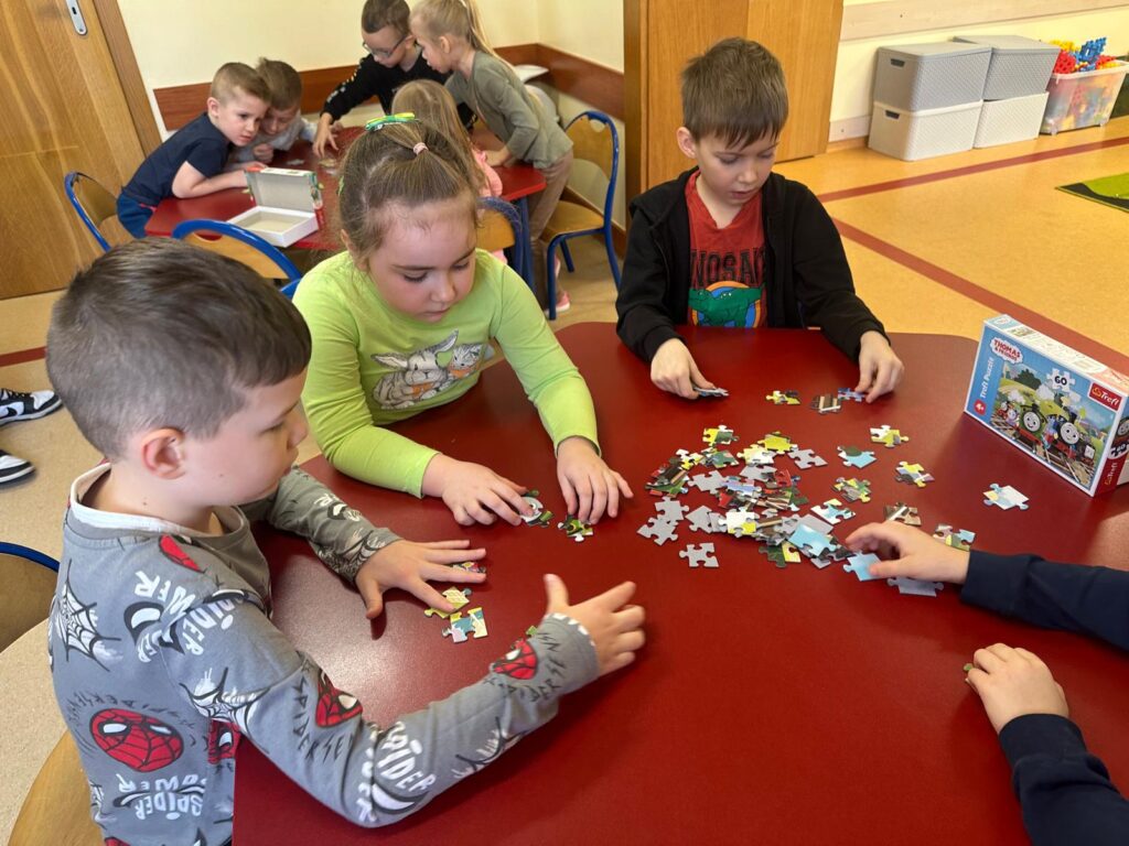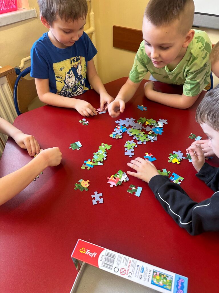 29 stycznia 2025 roku obchodziliśmy w naszym przedszkolu Dzień Puzzli. Dzieci miały okazję poznać historię powstania puzzli, samodzielnie układały puzzle o zróżnicowanym stopniu trudności, tworzyły z rozsypanki puzzlowej kompozycje zimowe. Nie zabrakło również zabaw ruchowych takich jak „Dobieramy się w pary” czy „Puzzlowy taniec”. Wszyscy dobrze się bawili i bardzo chętnie brali udział w zabawach, a nasz puzzlowy dzień trwał do zamknięcia przedszkola, a może jeszcze dłużej…………