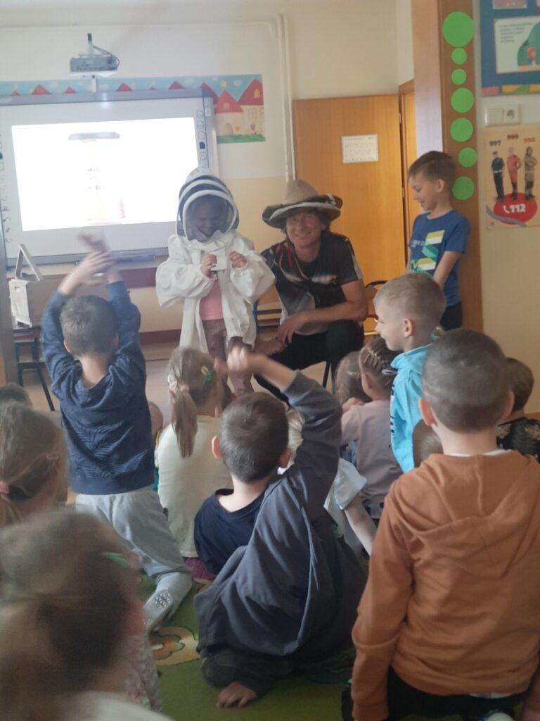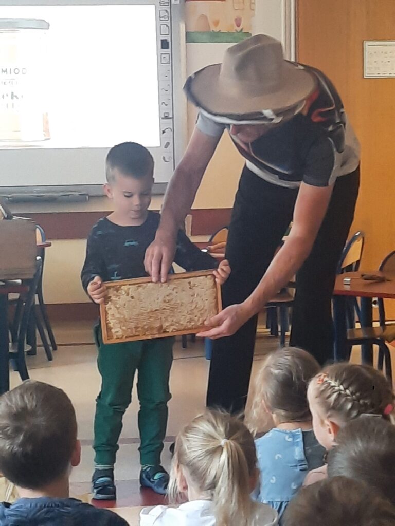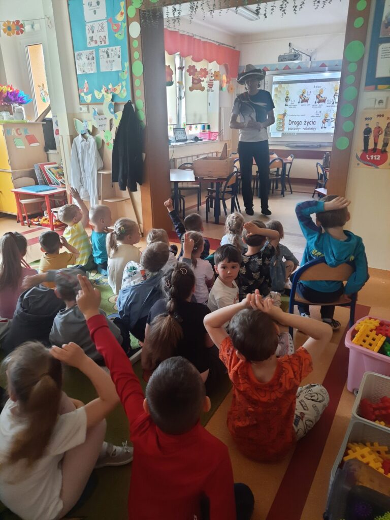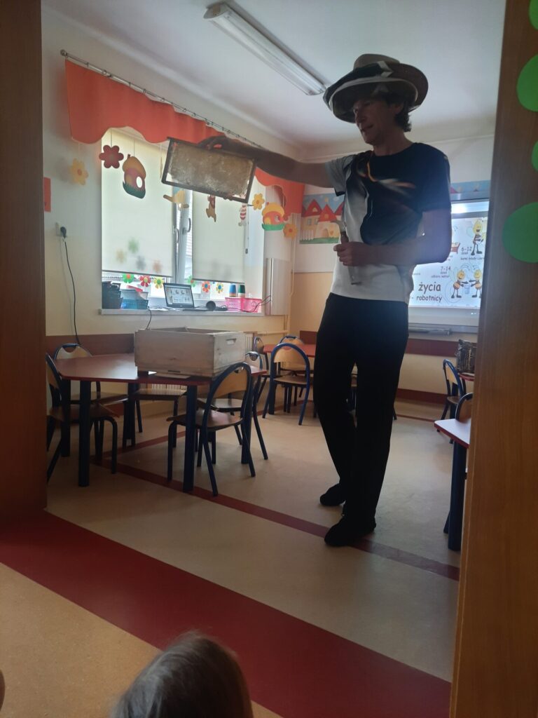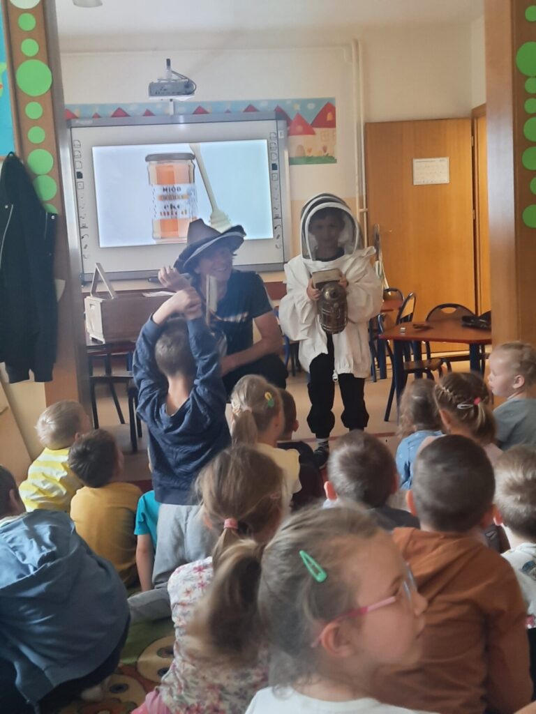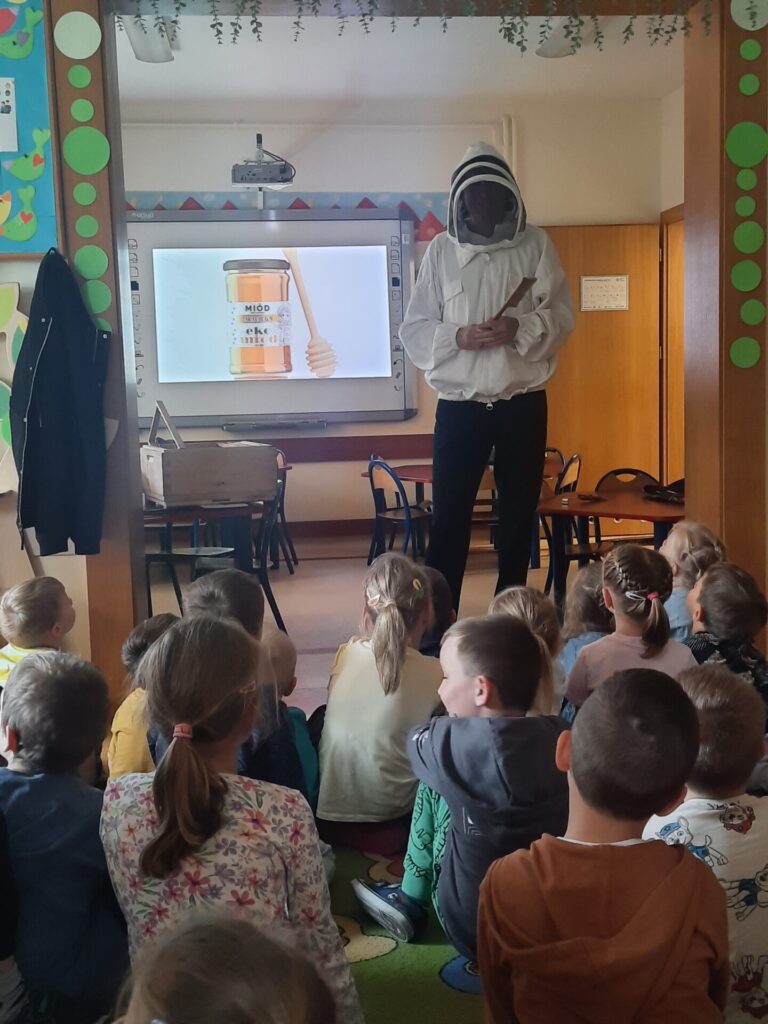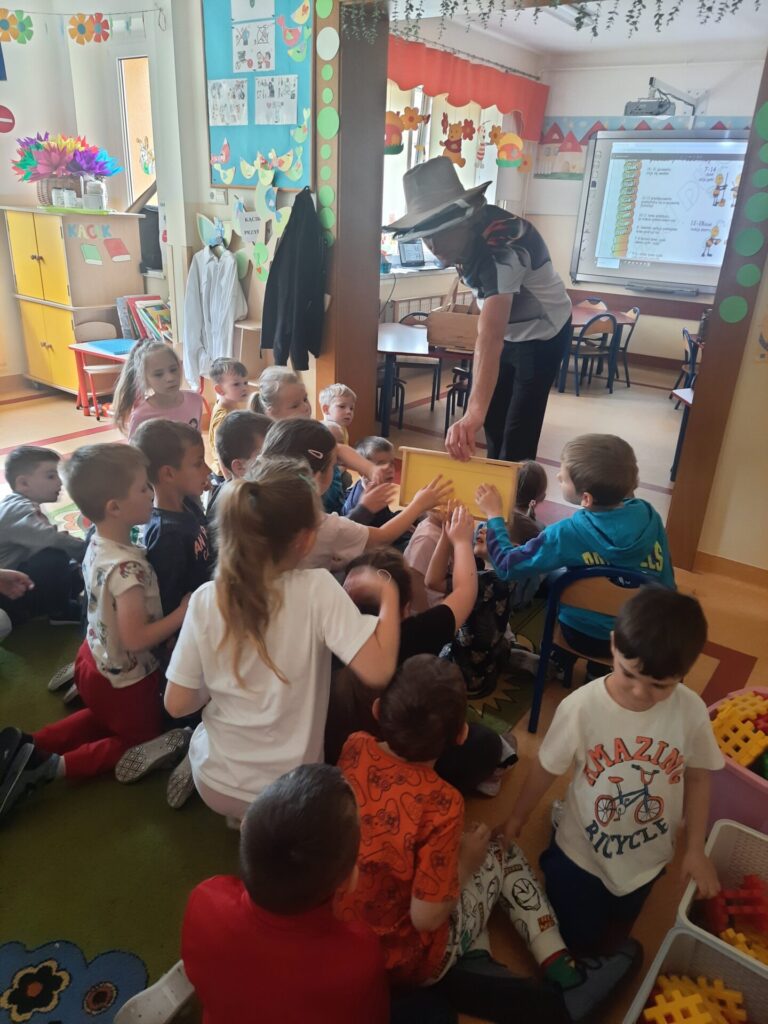 W miniony wtorek 20.05.2025r., w ramach obchodów Światowego Dnia Pszczół, nasze przedszkole zamieniło się w prawdziwą miodową krainę! Z tej okazji gościliśmy niezwykłego gościa – prawdziwego pszczelarza, pana Jacka, który wprowadził nas w fascynujący świat pszczół. Spotkanie rozpoczęło się od krótkiej, ale bardzo wciągającej prezentacji. Pan Jacek opowiedział nam o tym, jak ważne są pszczoły dla naszej planety, wyjaśniając, że bez nich nie mielibyśmy wielu owoców, warzyw czy nawet kwiatów. Dzieci z otwartymi buziami słuchały o życiu w ulu, o królowej, robotnicach i trutniach. Dowiedziały się, jak pszczoły zbierają nektar i pyłek, a potem zamieniają je w pyszny miód. Największą atrakcją była oczywiście możliwość obejrzenia prawdziwego ula (na szczęście pustego i bezpiecznego dla dzieci!). Pan Jacek przyniósł też ze sobą specjalny strój pszczelarza, który dzieci mogły przymierzyć. Było przy tym mnóstwo śmiechu i radosnego zamieszania! Pszczelarz pokazał nam również różne narzędzia, których używa w swojej pracy, a także plastry miodu – niektóre już wypełnione słodkim nektarem. Na zakończenie spotkania każde dziecko otrzymało małą degustację świeżego miodu. Spotkanie z pszczelarzem było nie tylko świetną zabawą, ale przede wszystkim cenną lekcją. Dzieci zrozumiały, że pszczoły to mali, ale niezwykle ważni mieszkańcy naszej Ziemi, których trzeba chronić. Mamy nadzieję, że dzięki takim inicjatywom nasze przedszkolaki wyrosną na świadomych i odpowiedzialnych przyjaciół natury. Serdecznie dziękujemy Panu Jackowi za wspaniałą lekcję przyrody.