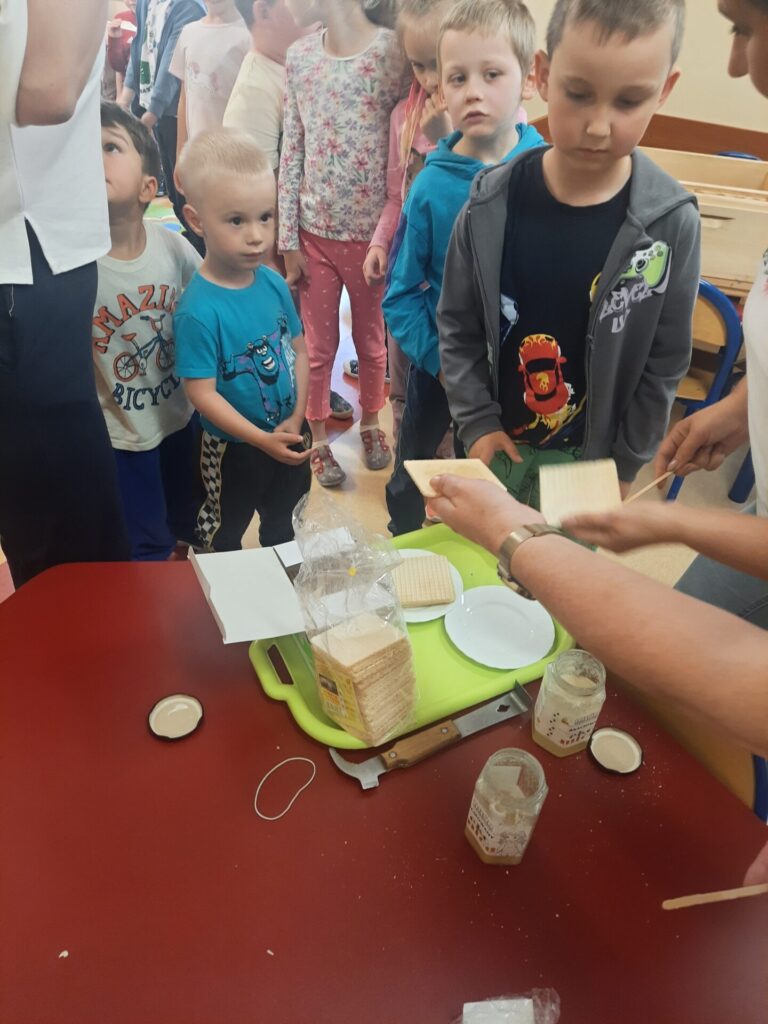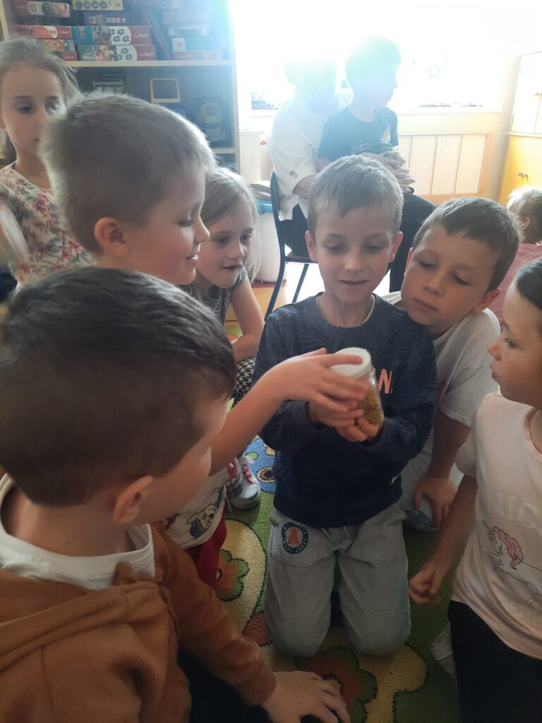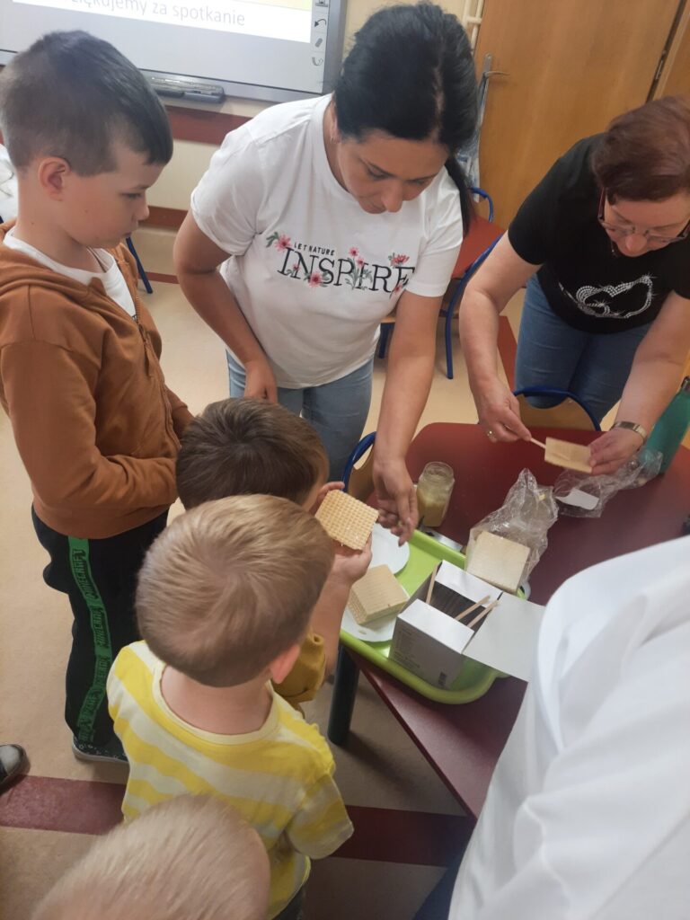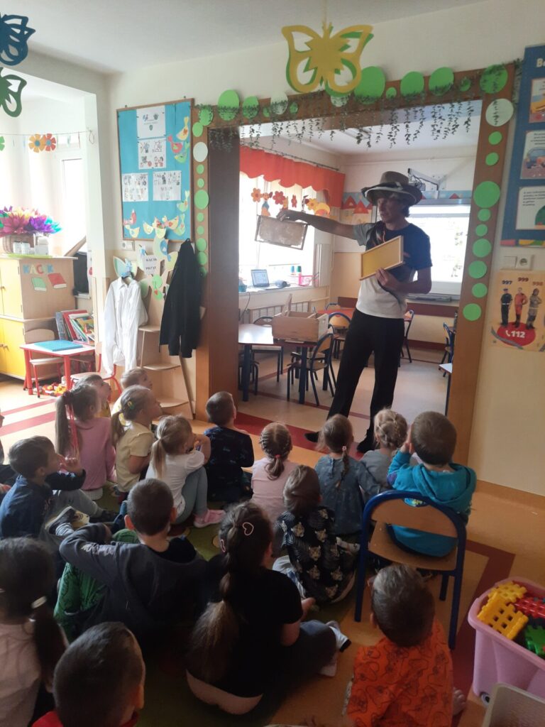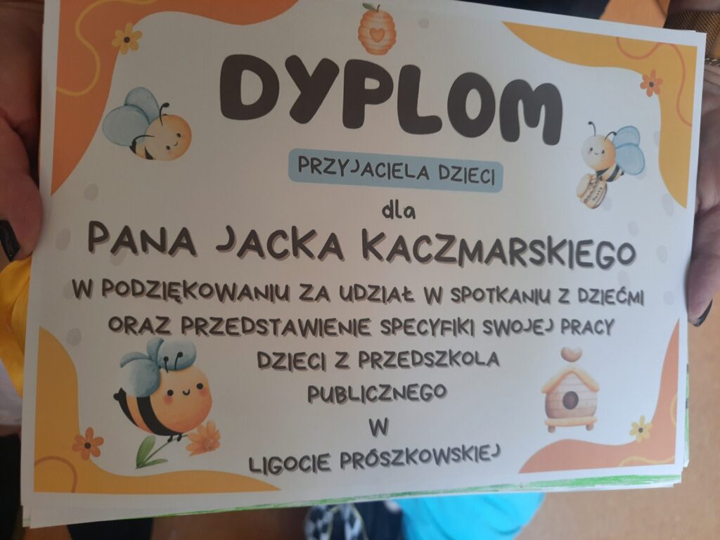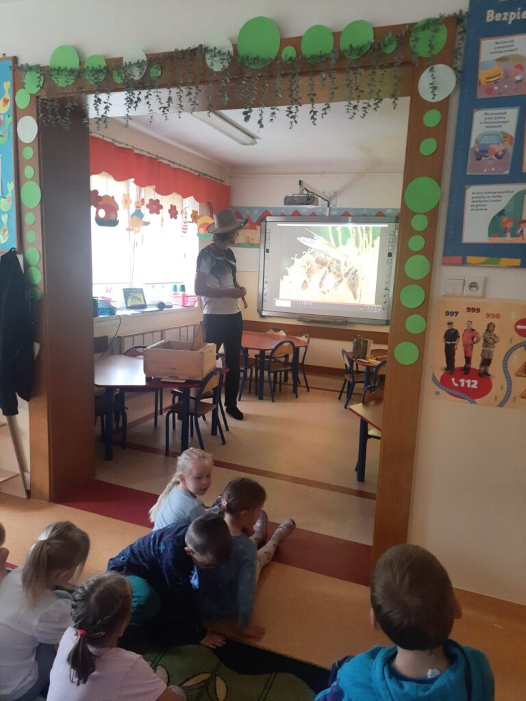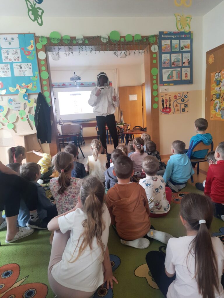W miniony wtorek 20.05.2025r., w ramach obchodów Światowego Dnia Pszczół, nasze przedszkole zamieniło się w prawdziwą miodową krainę! Z tej okazji gościliśmy niezwykłego gościa – prawdziwego pszczelarza, pana Jacka, który wprowadził nas w fascynujący świat pszczół. Spotkanie rozpoczęło się od krótkiej, ale bardzo wciągającej prezentacji. Pan Jacek opowiedział nam o tym, jak ważne są pszczoły dla naszej planety, wyjaśniając, że bez nich nie mielibyśmy wielu owoców, warzyw czy nawet kwiatów. Dzieci z otwartymi buziami słuchały o życiu w ulu, o królowej, robotnicach i trutniach. Dowiedziały się, jak pszczoły zbierają nektar i pyłek, a potem zamieniają je w pyszny miód. Największą atrakcją była oczywiście możliwość obejrzenia prawdziwego ula (na szczęście pustego i bezpiecznego dla dzieci!). Pan Jacek przyniósł też ze sobą specjalny strój pszczelarza, który dzieci mogły przymierzyć. Było przy tym mnóstwo śmiechu i radosnego zamieszania! Pszczelarz pokazał nam również różne narzędzia, których używa w swojej pracy, a także plastry miodu – niektóre już wypełnione słodkim nektarem. Na zakończenie spotkania każde dziecko otrzymało małą degustację świeżego miodu. Spotkanie z pszczelarzem było nie tylko świetną zabawą, ale przede wszystkim cenną lekcją. Dzieci zrozumiały, że pszczoły to mali, ale niezwykle ważni mieszkańcy naszej Ziemi, których trzeba chronić. Mamy nadzieję, że dzięki takim inicjatywom nasze przedszkolaki wyrosną na świadomych i odpowiedzialnych przyjaciół natury. Serdecznie dziękujemy Panu Jackowi za wspaniałą lekcję przyrody.