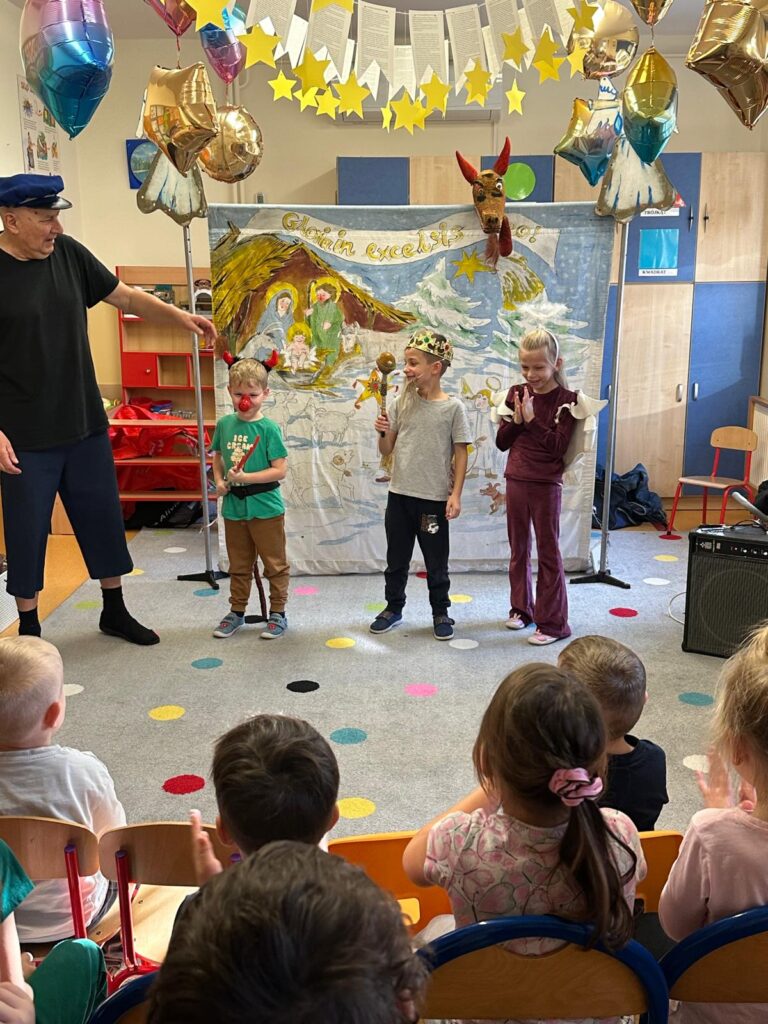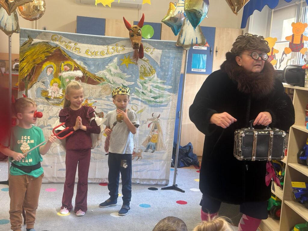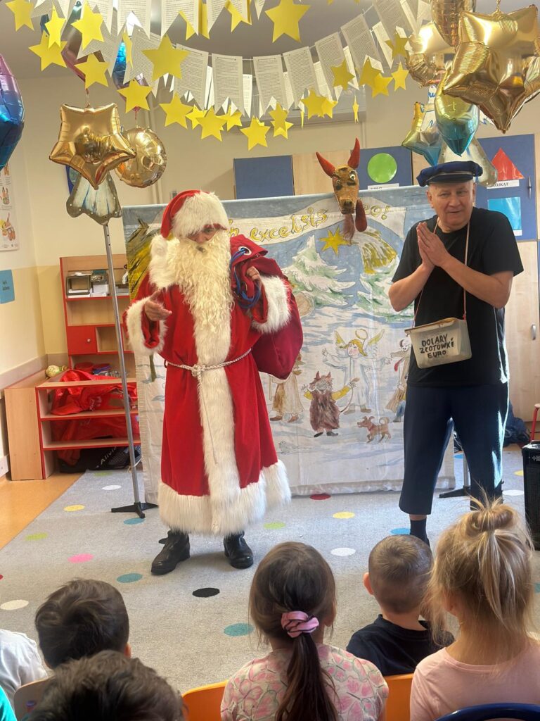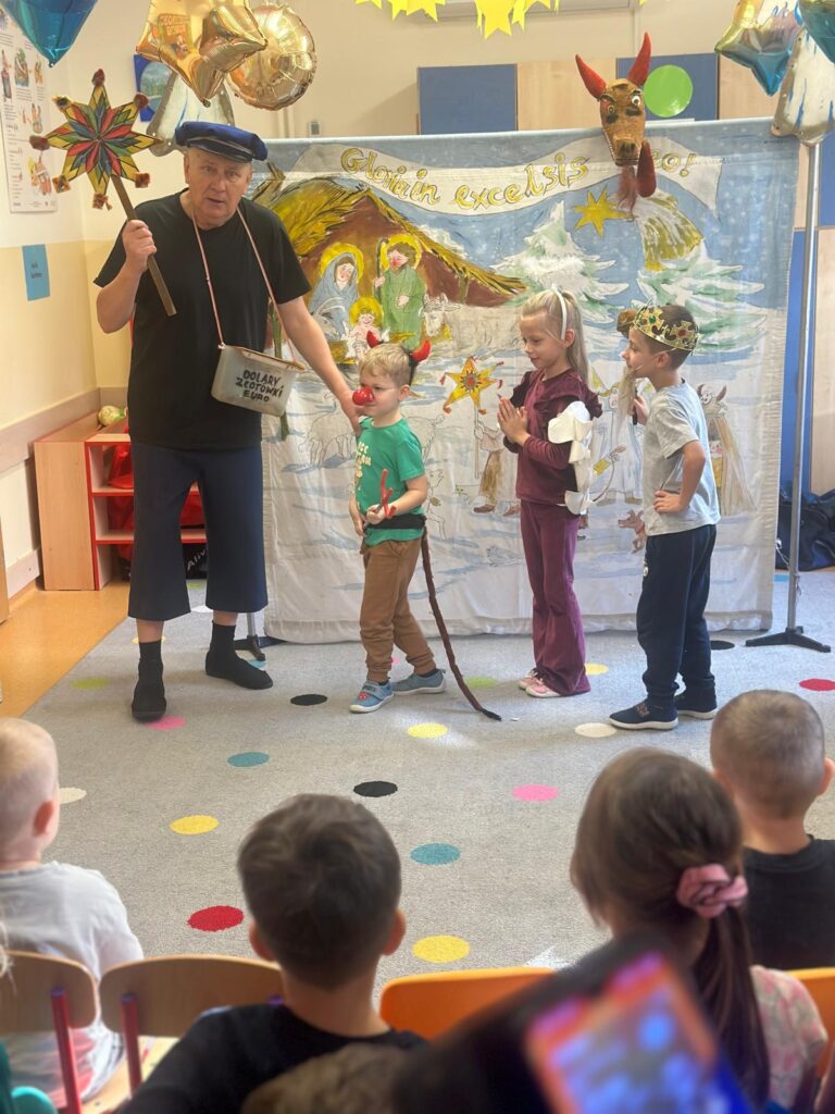 11 grudnia 2025 roku  nasze przedszkole odwiedził wyjątkowy gość, bardzo lubiany przez wszystkie przedszkolaki – Wróbelek Elemelek, który zaprosił dzieci na teatrzyk pt. „Świąteczni goście Elemelka”. Był to pełen  humoru i magii teatrzyk, w czasie którego dzieci miały możliwość występowania na scenie razem z aktorami wcielając się w role aniołka, króla czy chochlika. Dzieci siedziały jak zaczarowane zwłaszcza wtedy, gdy na scenie pojawił się  Mikołaj z wielkim workiem prezentów dla wróbelka Elemelka. Spektakl ten wypełnił śmiechem i śpiewem całe przedszkole.  Z niecierpliwością wyczekujemy kolejnych odwiedzin Wróbelka Elemelka.