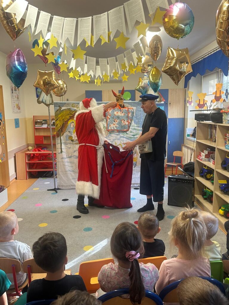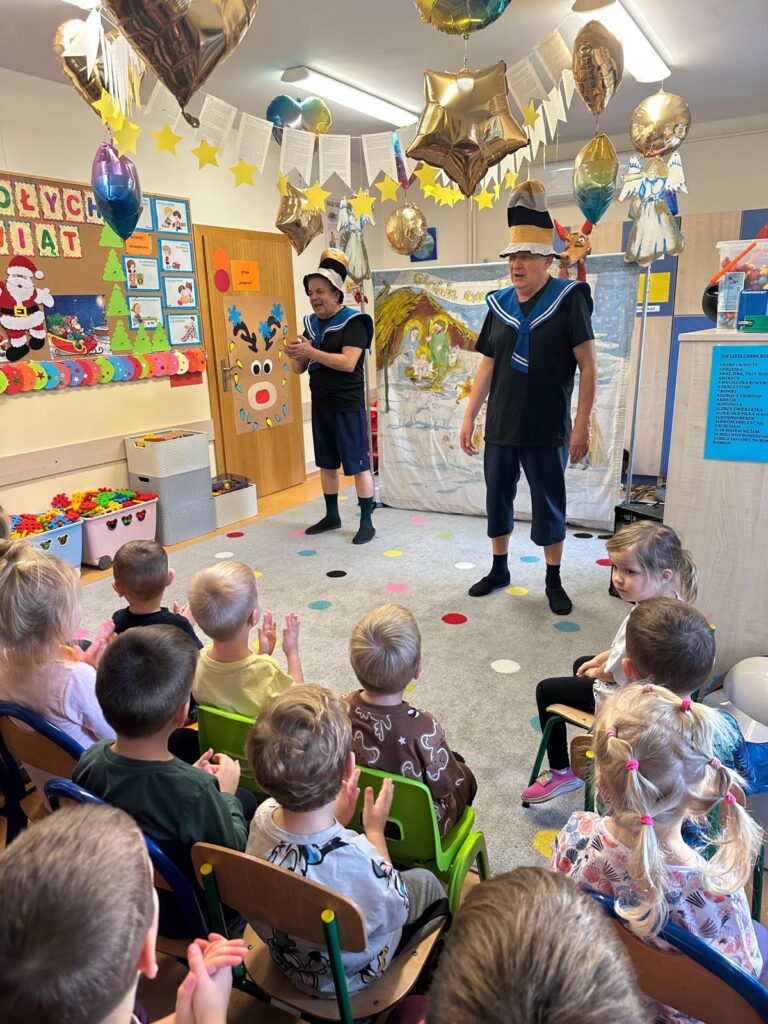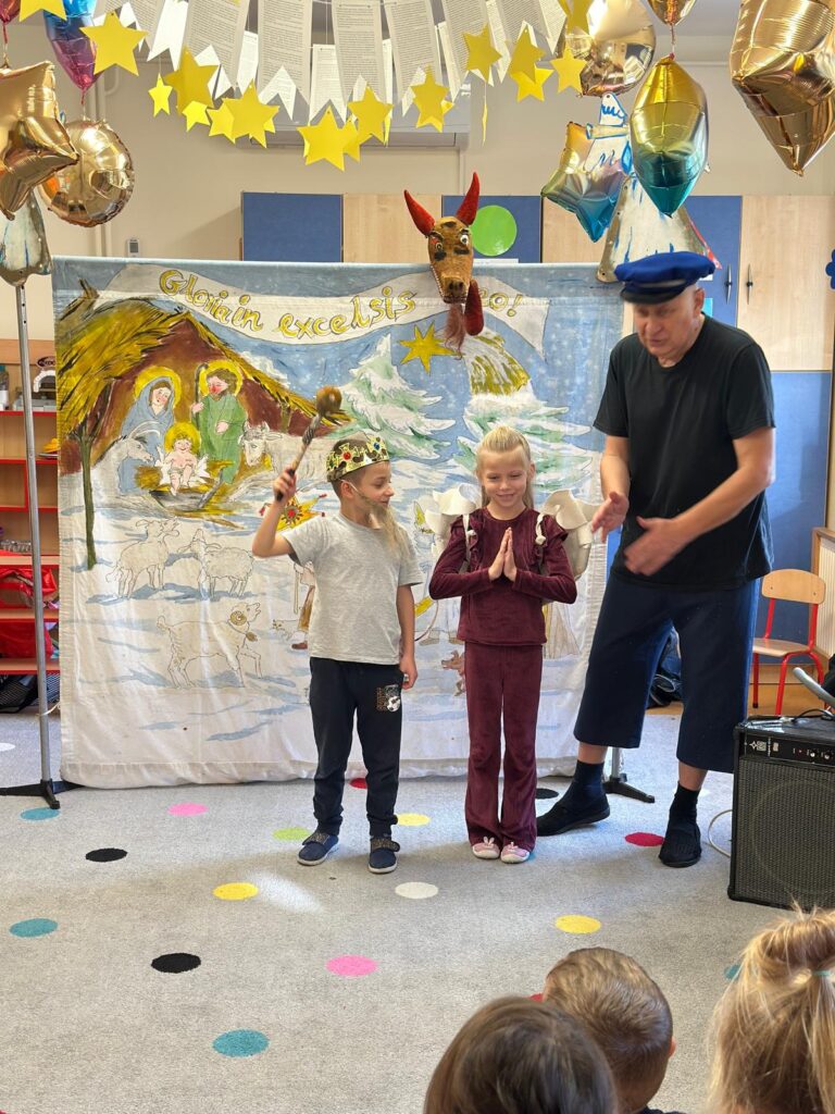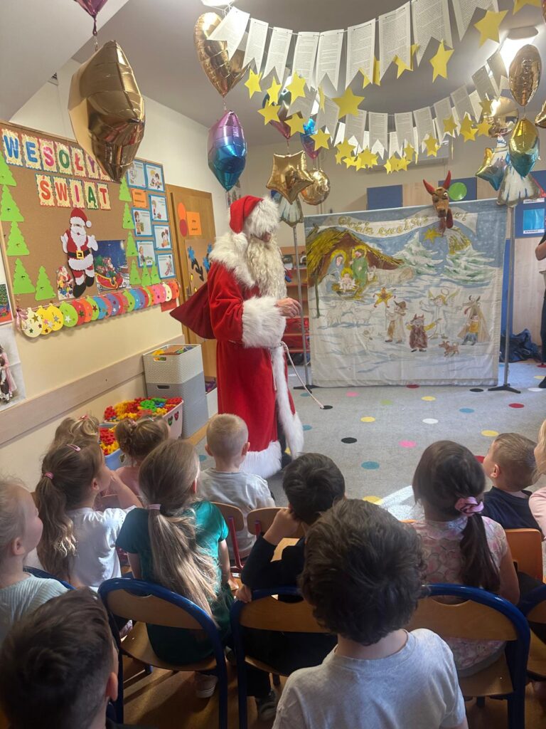 11 grudnia 2025 roku  nasze przedszkole odwiedził wyjątkowy gość, bardzo lubiany przez wszystkie przedszkolaki – Wróbelek Elemelek, który zaprosił dzieci na teatrzyk pt. „Świąteczni goście Elemelka”. Był to pełen  humoru i magii teatrzyk, w czasie którego dzieci miały możliwość występowania na scenie razem z aktorami wcielając się w role aniołka, króla czy chochlika. Dzieci siedziały jak zaczarowane zwłaszcza wtedy, gdy na scenie pojawił się  Mikołaj z wielkim workiem prezentów dla wróbelka Elemelka. Spektakl ten wypełnił śmiechem i śpiewem całe przedszkole.  Z niecierpliwością wyczekujemy kolejnych odwiedzin Wróbelka Elemelka.