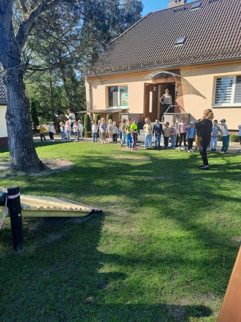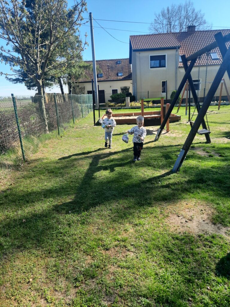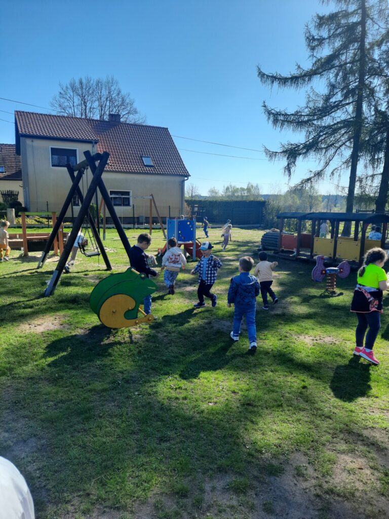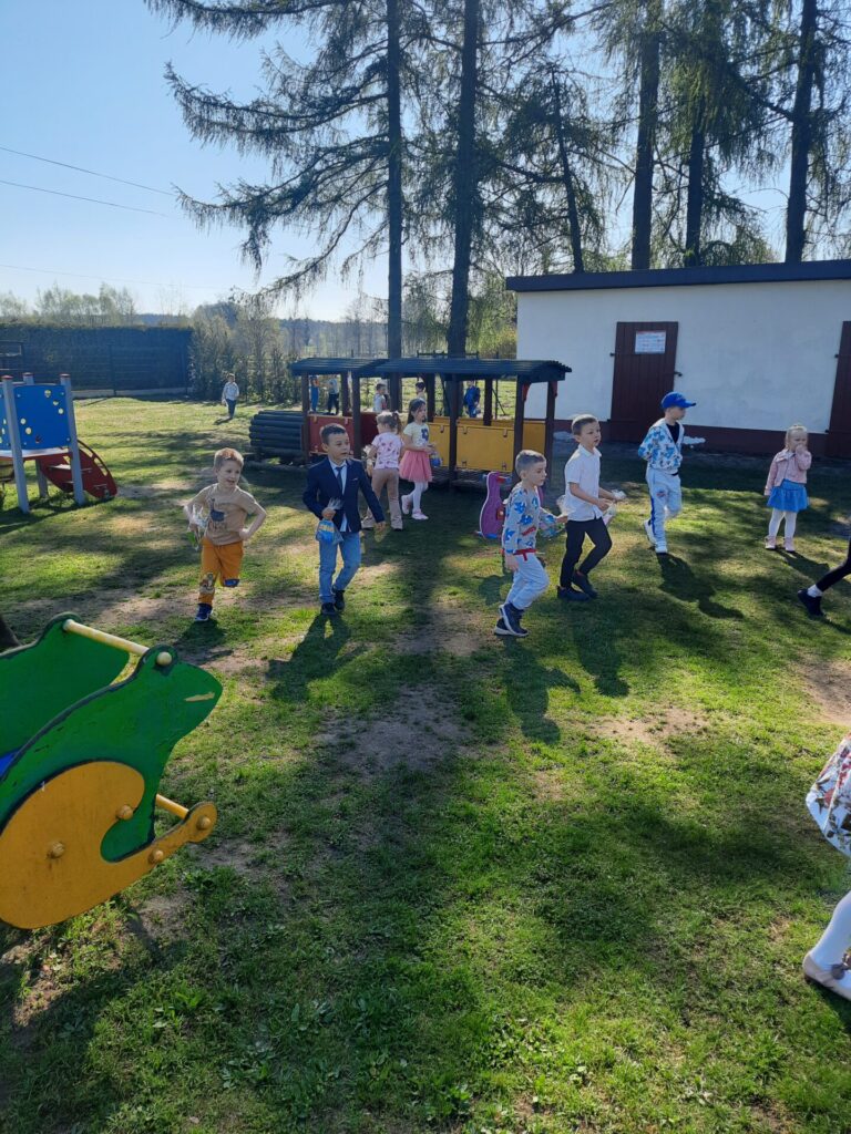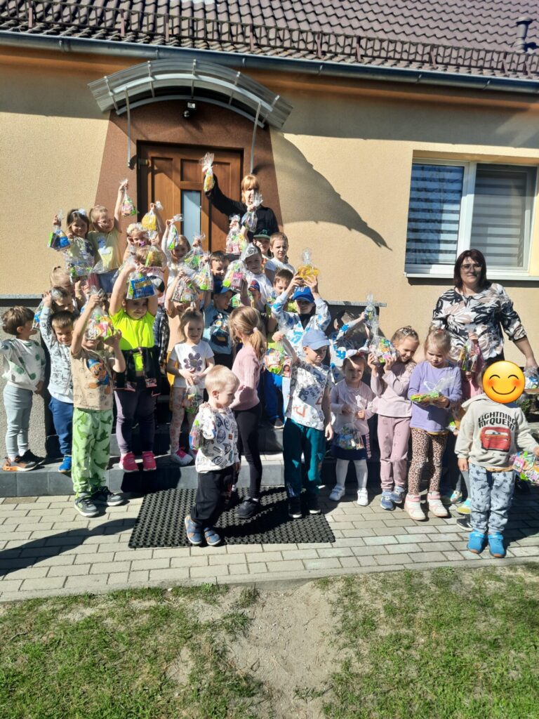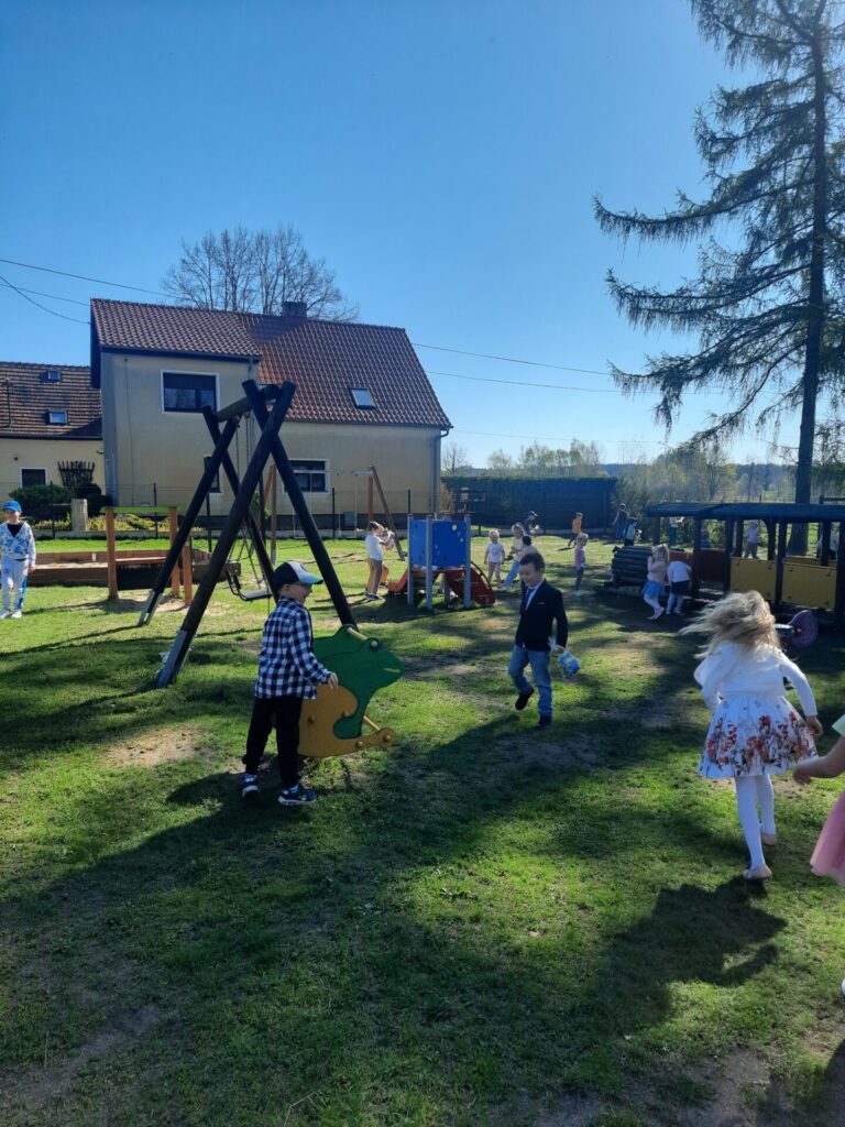 Jednak największą niespodzianką było poszukiwanie prezentów od zajączka! Po śniadaniu pani Dyrektor ogłosiła, że tajemniczy gość zostawił dla nich w ogrodzie ukryte upominki. Z podekscytowaniem w oczach dzieci ruszyły na poszukiwania. Wśród krzewów, pod drzewami i za huśtawkami czekały na nie kolorowe paczuszki, koszyczki i słodkie niespodzianki. Radości i piskom nie było końca, gdy każde dziecko odnalazło swój wielkanocny skarb. Z uśmiechami na twarzach i pełnymi rączkami smakołyków, przedszkolaki wróciły do sali, dzieląc się wrażeniami i ciesząc się z prezentów od zajączka.