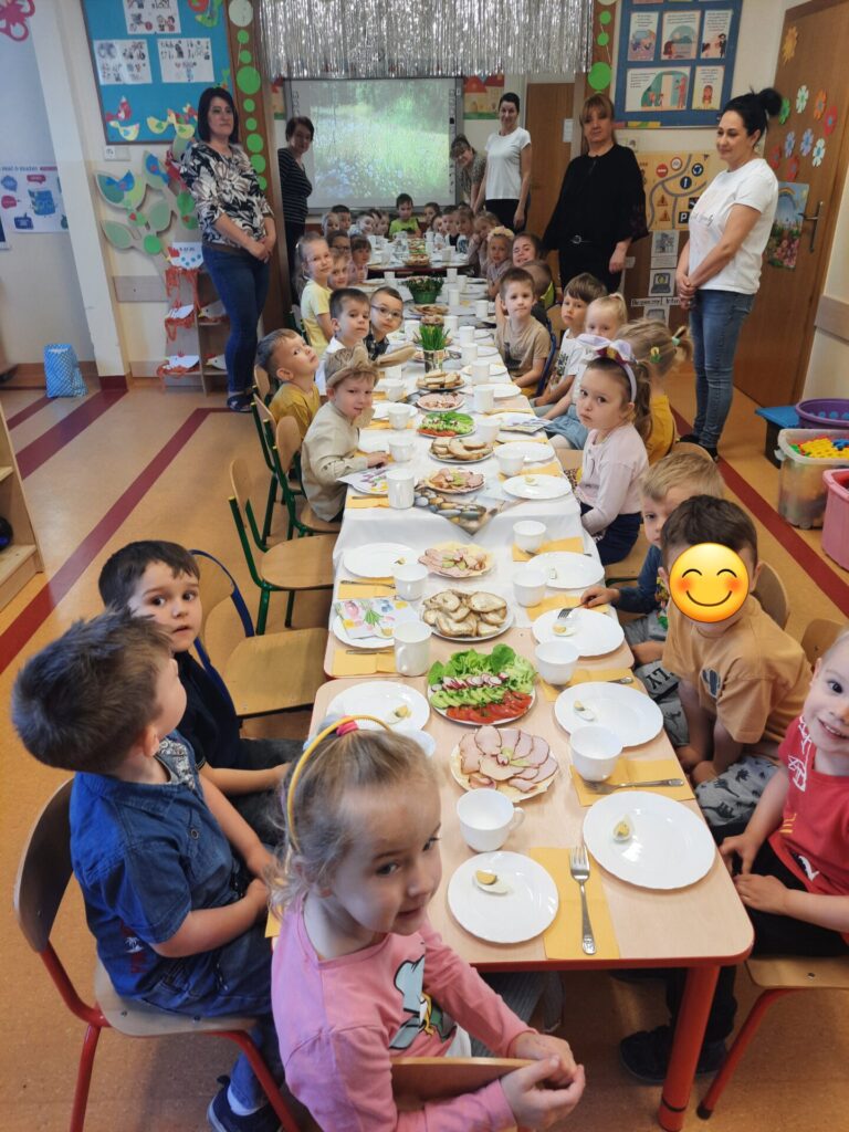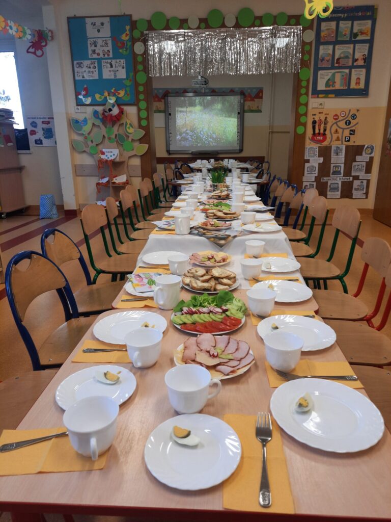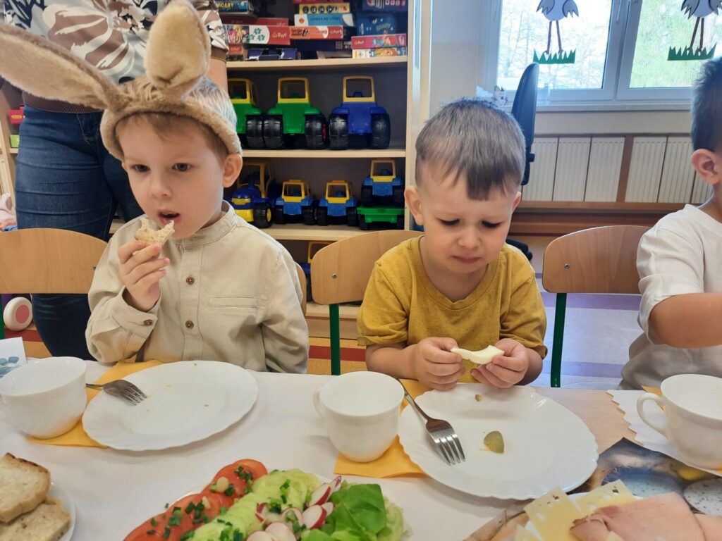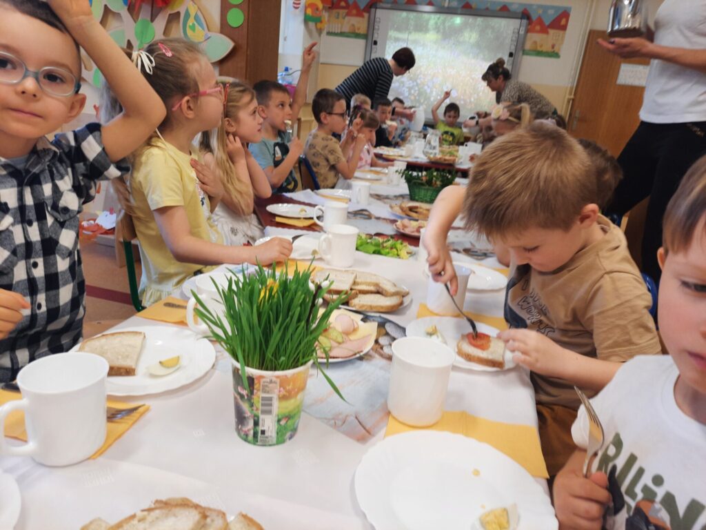 W naszym przedszkolu zawitały już święta. W środę 16.04, dzień rozpoczął się wyjątkowo radośnie. Już od rana w powietrzu czuć było świąteczną atmosferę. Na pięknie udekorowanych stołach czekało pyszne, kolorowe śniadanie wielkanocne. Nie zabrakło tradycyjnych jajek na twardo, apetycznych wędlin, świeżego pieczywa i kolorowych warzyw. Dzieci z apetytem zajadały świąteczne przysmaki, dzieląc się radosnymi opowieściami o przygotowaniach do świąt w swoich domach..
