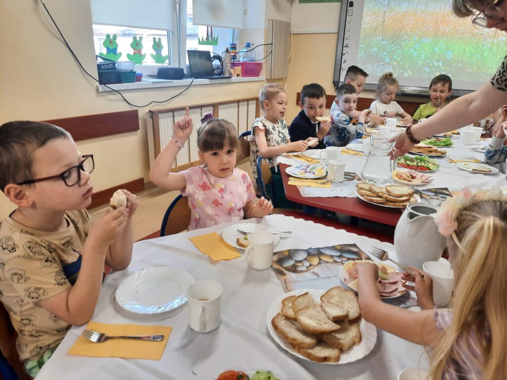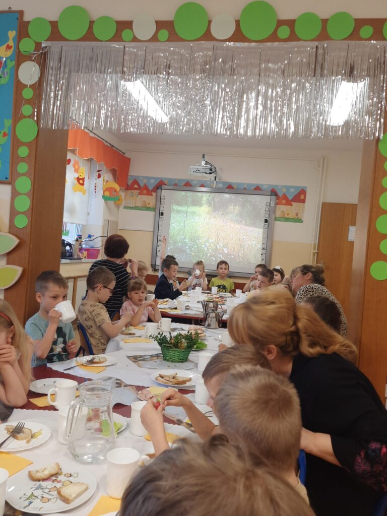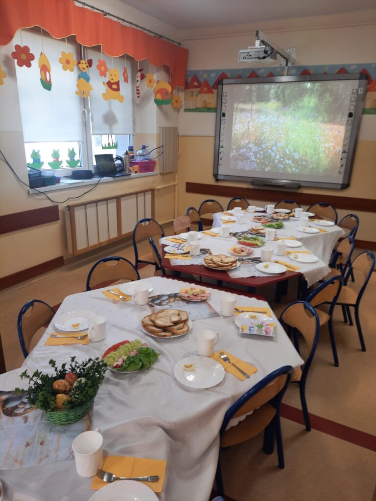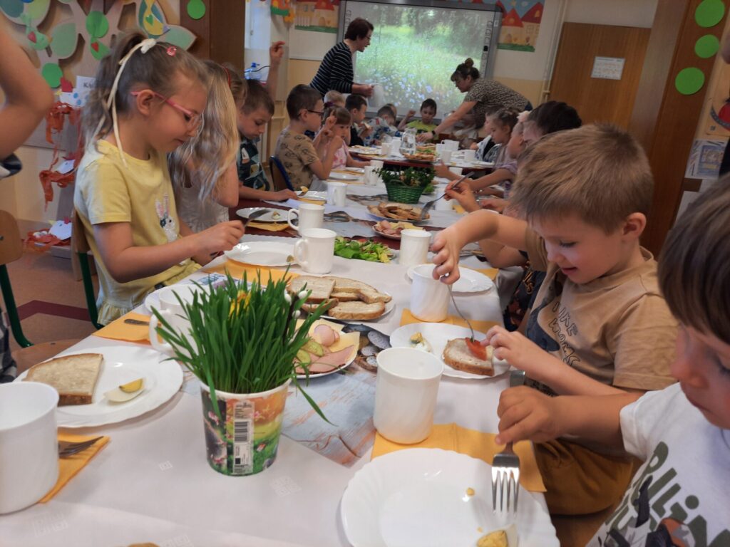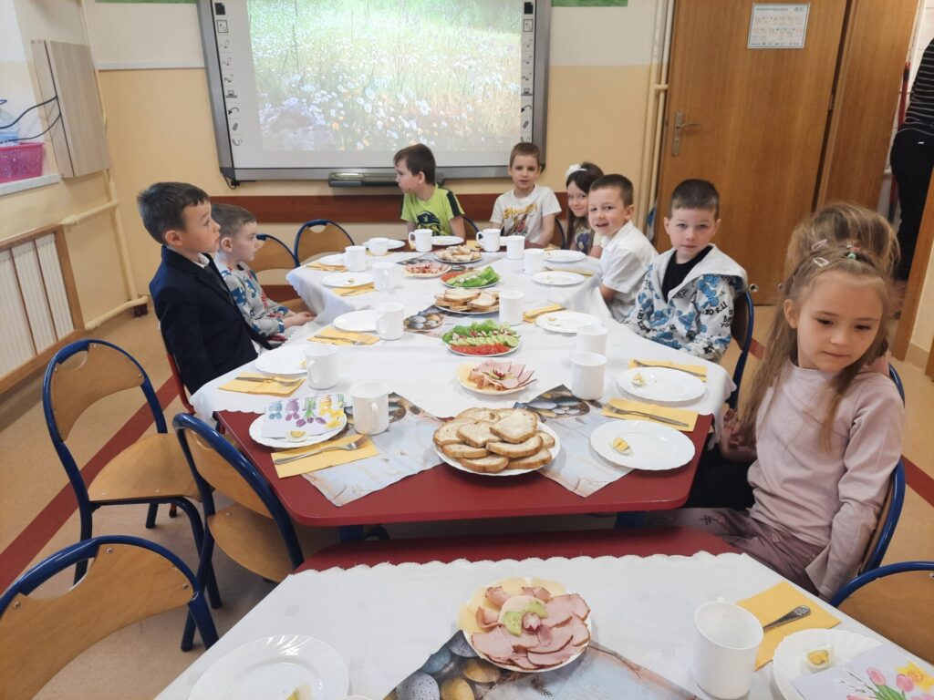 W naszym przedszkolu zawitały już święta. W środę 16.04, dzień rozpoczął się wyjątkowo radośnie. Już od rana w powietrzu czuć było świąteczną atmosferę. Na pięknie udekorowanych stołach czekało pyszne, kolorowe śniadanie wielkanocne. Nie zabrakło tradycyjnych jajek na twardo, apetycznych wędlin, świeżego pieczywa i kolorowych warzyw. Dzieci z apetytem zajadały świąteczne przysmaki, dzieląc się radosnymi opowieściami o przygotowaniach do świąt w swoich domach..